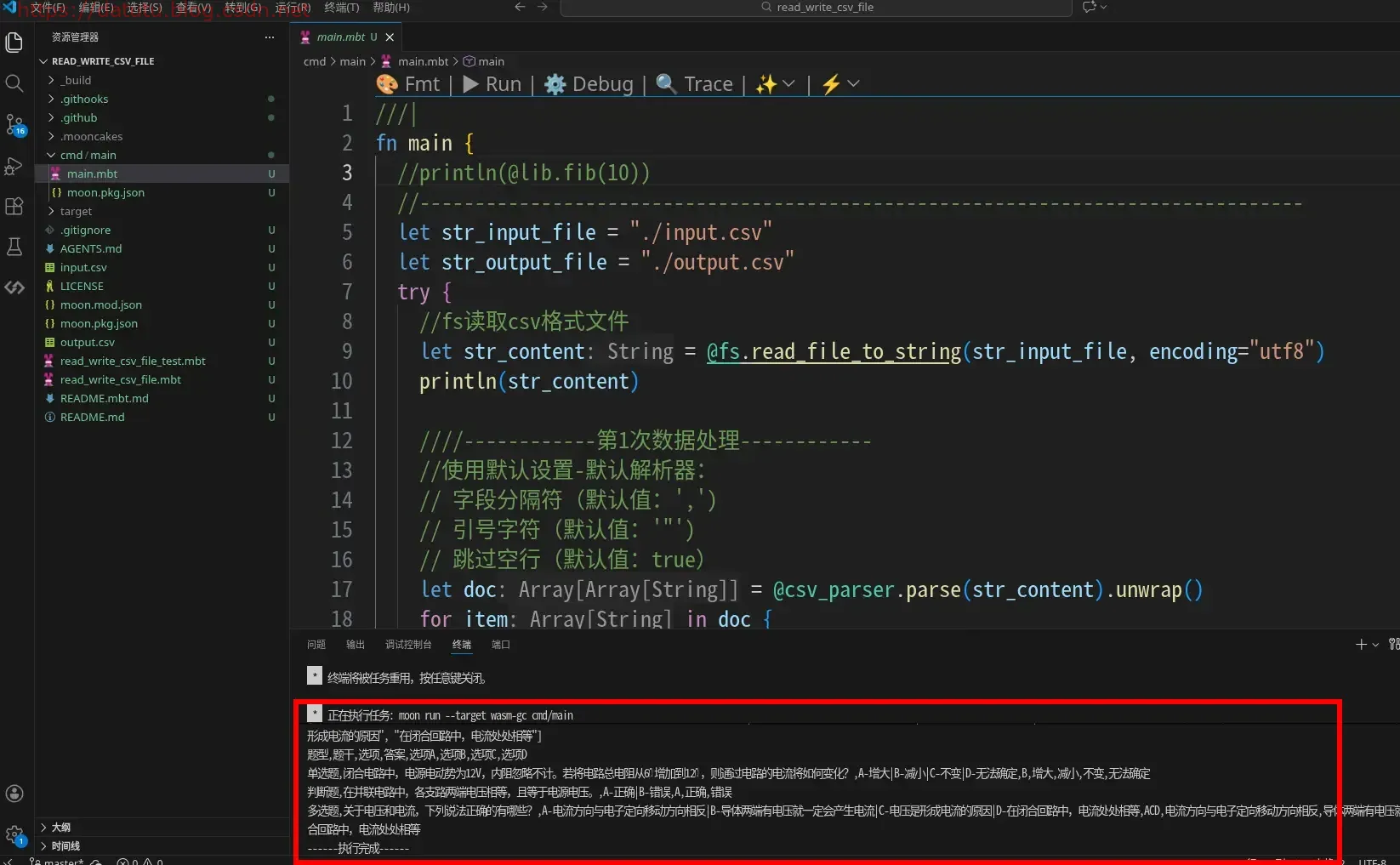 MoonBit国产编程语言读写CSV格式文件-高级篇 2026年2月1日 星如雨落 下面重点介绍MoonBit读写CSV格式文件后,对`input.csv`文件数据解析处理符合自己要求,再整合数据后,最后写入新的CSV格式文件。